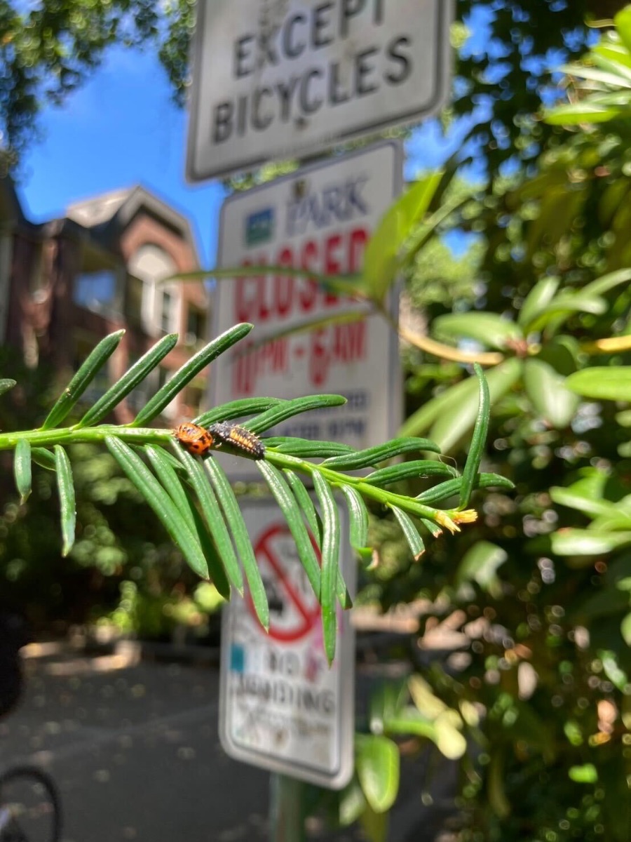 バンクバーの住宅街に、てんとう虫の幼虫とサナギが一緒にいたよ!