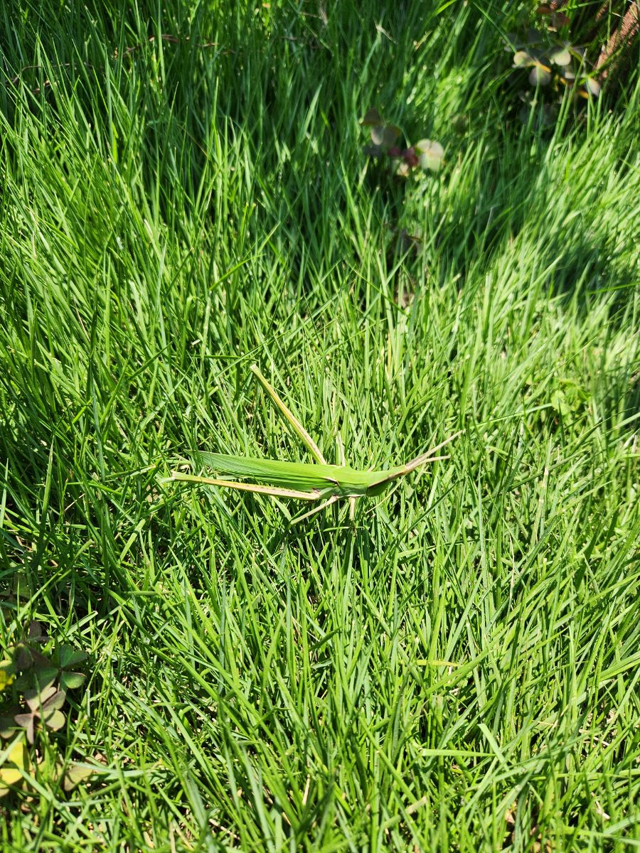 おじいちゃんの畑で巨大なバッタを見つけたよ☺