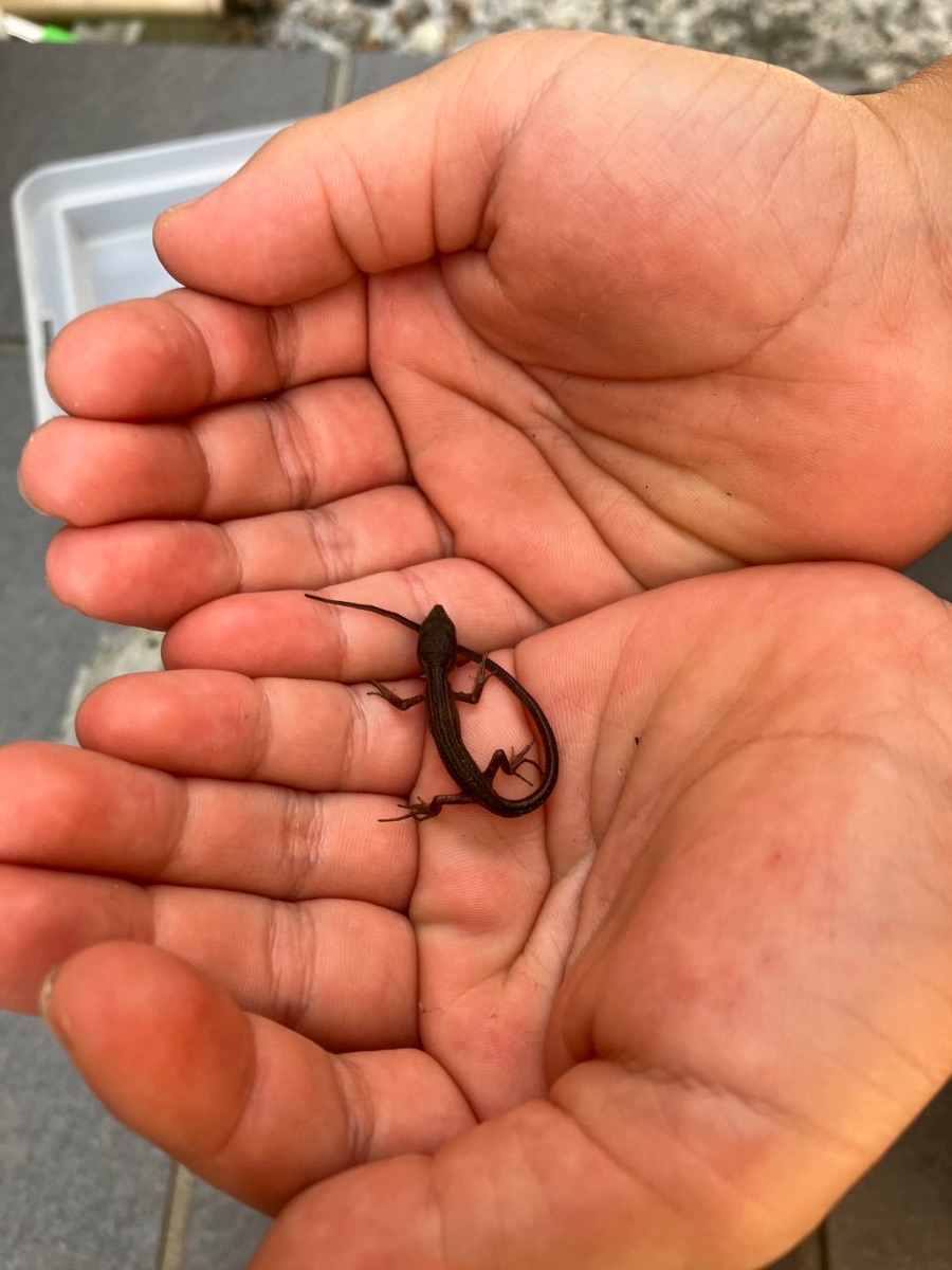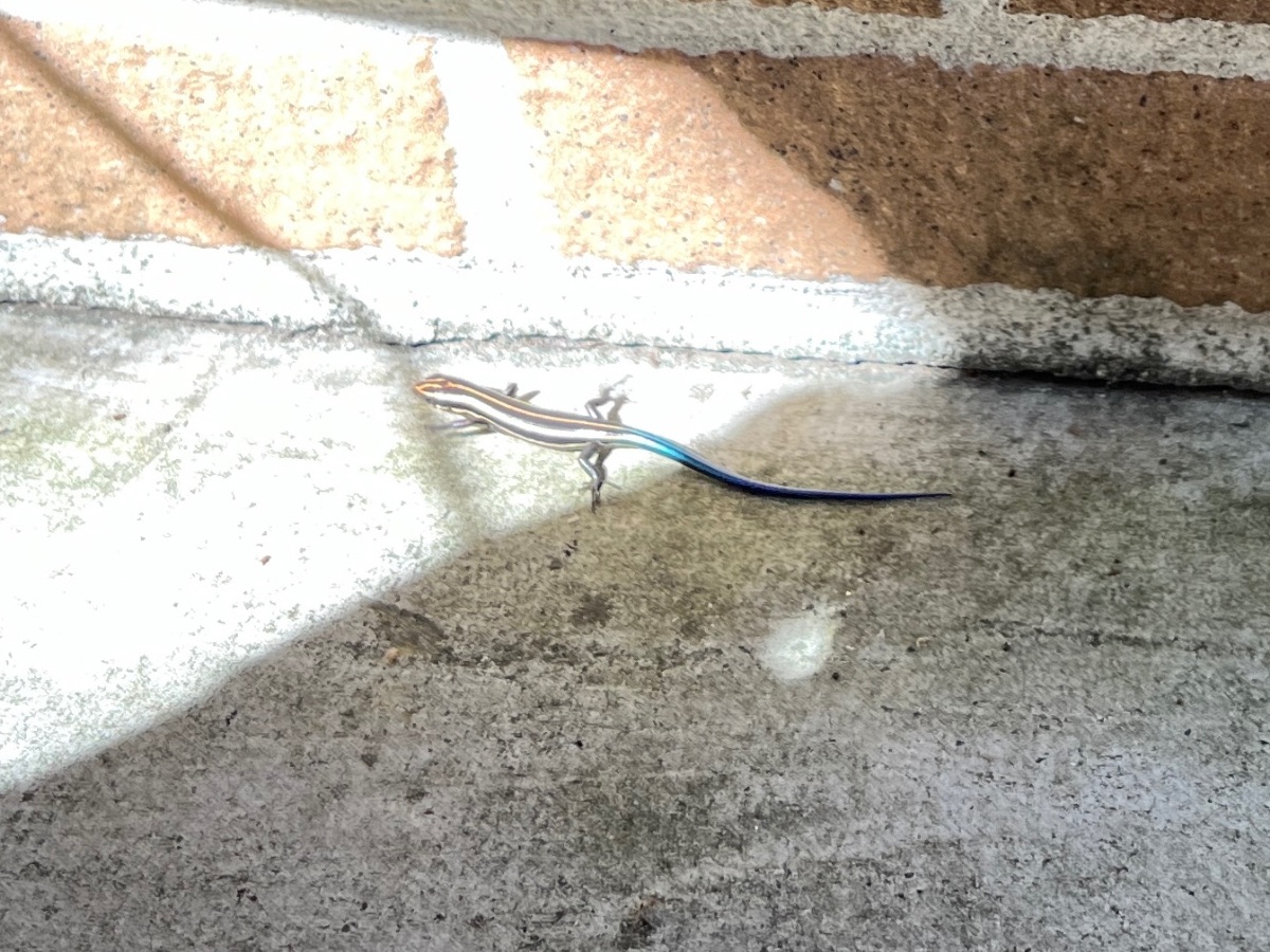 家の駐輪場でトカゲ発見した!尻尾がキレイな色してたよ。