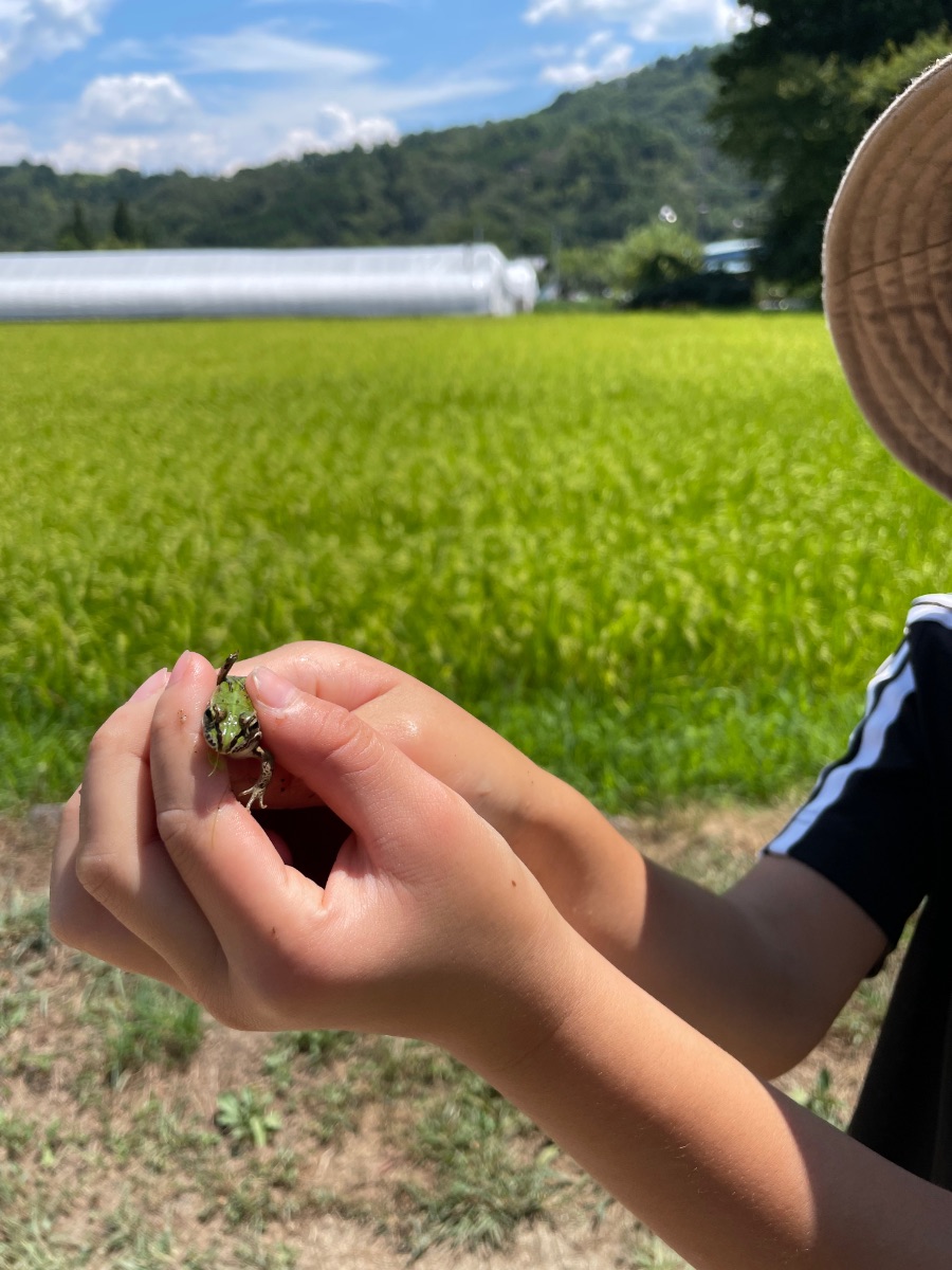 大きいカエルは早すぎて逃げられたけど、田んぼの横のいけすに何匹もいたよ